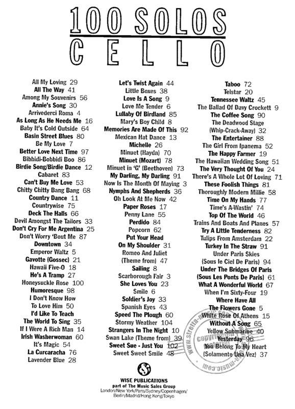100 SOLOS CELLO iz kategorije zabavna glasba sodi med odlične čelo.All My Loving All The Way Among My Souvenirs Annie's Song Arriverderci Roma As Long As He Needs Me Baby It's Cold ...