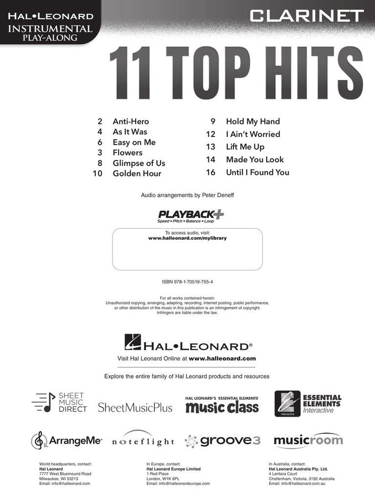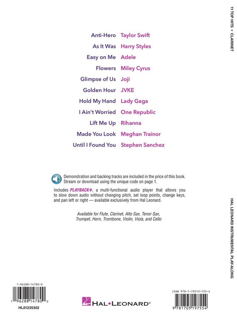 11 TOP HITS CLARINET PLAY ALONG + AUDIO ACCESS iz kategorije zabavna glasba sodi med odlične klarinet.HL01235302 1. Hold My Hand 2. Lift Me Up 3. Flowers 4. Golden Hour 5. Easy On ...