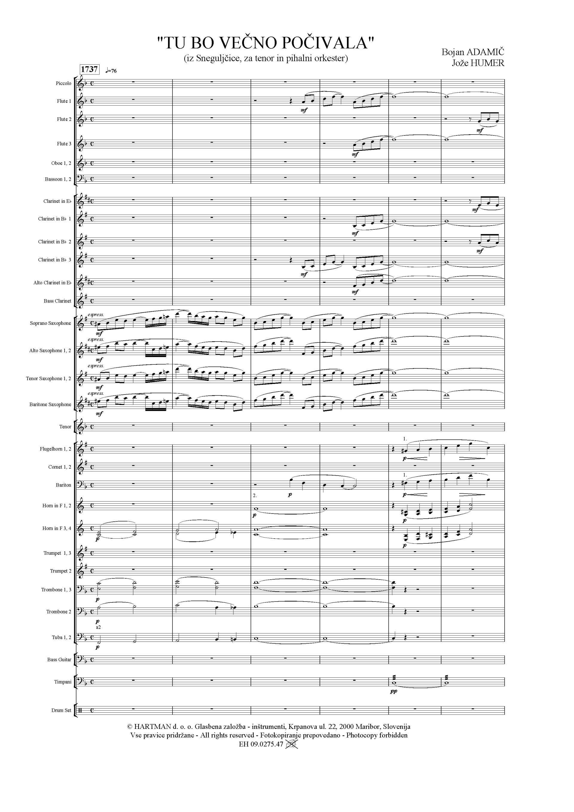 ADAMIČ B. - TU BO VEČNO POČIVALA, arija iz Sneguljčice za tenor in pihalni orkes iz kategorije zabavni program sodi med odlične Pihalni orkester.Težavnostna stopnja: C Trajanje: 3 ...