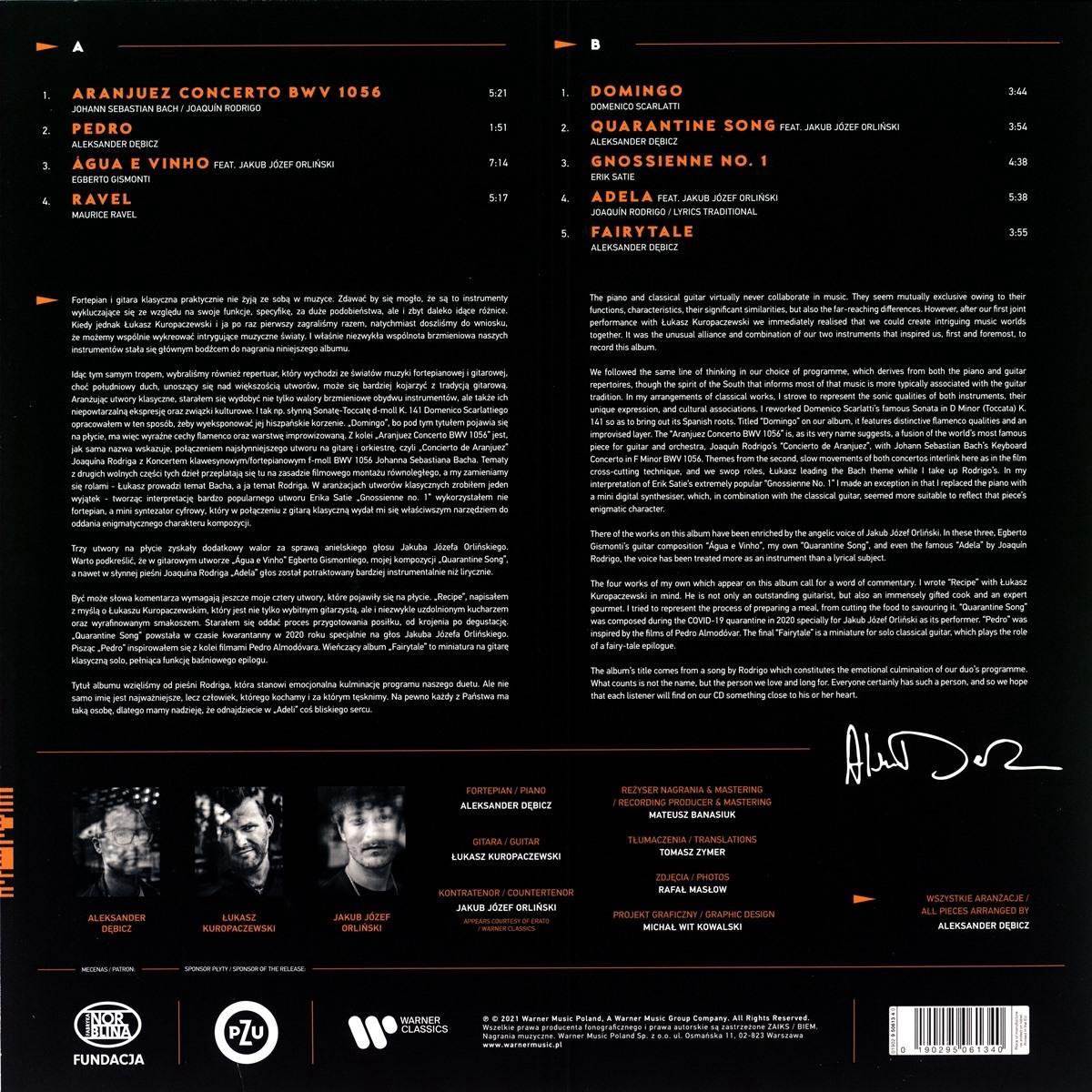 Omejeno stiskanje LP vinila oranžne barve. "Naslov albuma Adela izvira iz pesmi Rodriga, ki predstavlja čustveni vrhunec programa našega dua. Ne šteje ime, ampak oseba, ki jo imamo radi in po kateri hrepenimo. Takšno osebo zagotovo ima vsak, zato upamo, da bo vsak poslušalec bo na našem CD-ju našel nekaj, kar mu je pri srcu. Klavir in klasična kitara tako rekoč nikoli ne sodelujeta v glasbi. Vendar smo že po prvem skupnem nastopu z Lukaszom Kuropaczewskim takoj ugotovili, da lahko skupaj ustvarjamo intrigantne glasbene svetove. enako razmišljanje pri izbiri programa, ki izhaja tako iz klavirskega kot kitarskega repertoarja, čeprav je duh juga, ki vpliva na večino te glasbe, bolj tipično povezan s kitarsko tradicijo. V svojih priredbah klasičnih del sem si prizadeval da bi predstavil zvočne lastnosti obeh inštrumentov, njun edinstven izraz in kulturne zveze. Predelal sem znamenito "Sonato v d-molu" Domenica Scarlattija (Toccata )" K. 141, da bi razkrili svoje španske korenine. Na našem albumu z naslovom "Domingo" ima značilne flamenko lastnosti in improvizirano plast. "Aranjuez Concerto BWV 1056" je, kot že samo ime pove, zlitje najbolj znane skladbe na svetu za kitaro in orkester, "Concierto de Aranjuez" Joaquina Rodriga, s "Koncertom za klaviature v f-molu" Johanna Sebastiana Bacha BWV. Teme iz drugega, počasnih stavkov obeh koncertov se tukaj prepletajo kot v filmski tehniki presekanja in zamenjava vloge, Lukasz vodi Bachovo temo, jaz pa Rodrigovo."