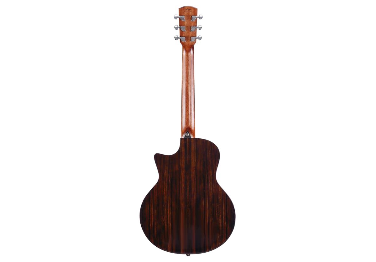 To je čudovita kitara z majhnim ohišjem z zvočno ploščo Shadowburst AA Solid Western Red Cedar in zadnjim in stranskim delom iz barve Macassar Ebony, z vezavo iz barve Macassar Ebony in poševnim naslonom za roke. Nedvomno ena najlepših potovalnih kitar, kar smo jih videli, a spet ti pomanjšani instrumenti niso več samo za potovanja.