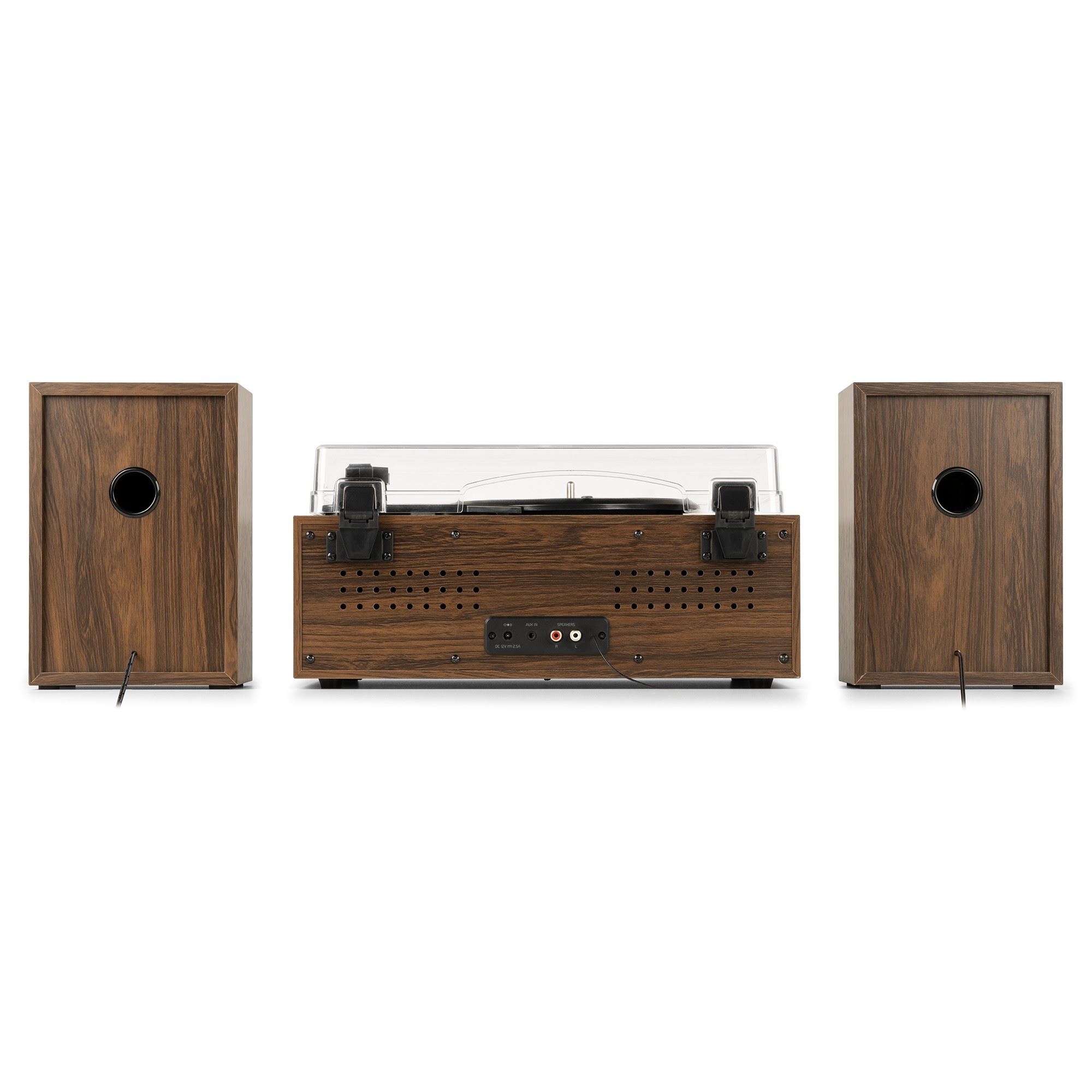 gramofonski set s svojim retro slogom je glasbeno središče, ki ni le lepo na pogled; prav tako je v središču vaše glasbene zbirke. Poslušajte vse svoje 7-, 10- in 12-palčne vinilne plošče v optimalni kakovosti prek dveh priloženih HIFI zvočnikov. Sprednjo stran v starinskem slogu zaznamujeta velik gumb za glasnost in dva tradicionalna merilnika VU. Bostonski glasbeni center ima tudi predvajalnik CD-jev, ki podpira MP3, vrata USB in vso sodobno tehnologijo, ki jo pričakujete, vključno z radiem DAB+ in vgrajenim predvajalnikom medijev BT za brezžično pretakanje glasbe.