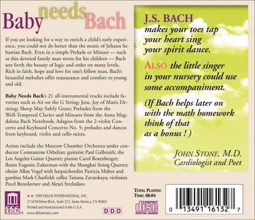Podarite svojemu otroku neprecenljivo darilo za intelekt in duha ... Če iščete način, kako obogatiti otrokove zgodnje izkušnje, potem je glasba Johanna Sebastiana Bacha najboljša. Bachova glasba je bogata z lastnostmi, ki jih cenimo skozi stoletja – vero, upanjem in ljubeznijo do bližnjega. Te pogosto izmuzljive lastnosti prežemajo Bachove čudovite, pomirjujoče melodije in nudijo tolažbo mladim in starim. Bachovo neprimerljivo glasbo je ustvarila inteligenca, ki ji ni para in ki jo le redki lahko dosežejo. V preprostem preludiju ali menuetu – kakršnega je ta predan družinski mož napisal za svoje otroke – na več ravneh predstavi lepoto logike in reda. Toda Bachovo inteligenco je dopolnjevala ganljiva osebna ponižnost, zaradi česar je njegov genij odprt za najvišji navdih. Osebno, duhovno sporočilo, ki sije skozi vsako frazo njegove glasbe, lahko vsrkajo tudi najmlajši med nami in ga cenijo vse življenje.