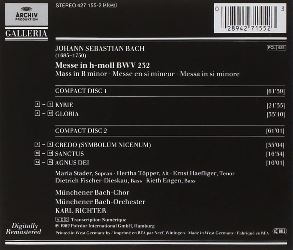 BACH J.S.:MESSE IN H-MOLL/STADER/FISCHER-DIESKAU/RICHTER 2CD