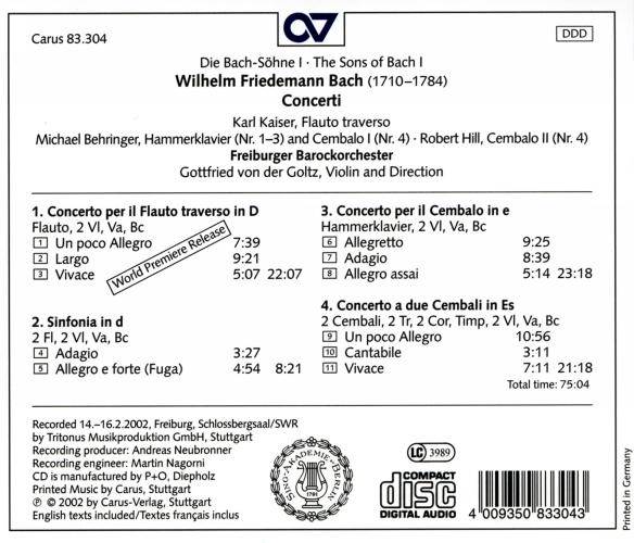 BACH W.F.:CONCERTI/FREIBURGER BAROCKORCHESTRA