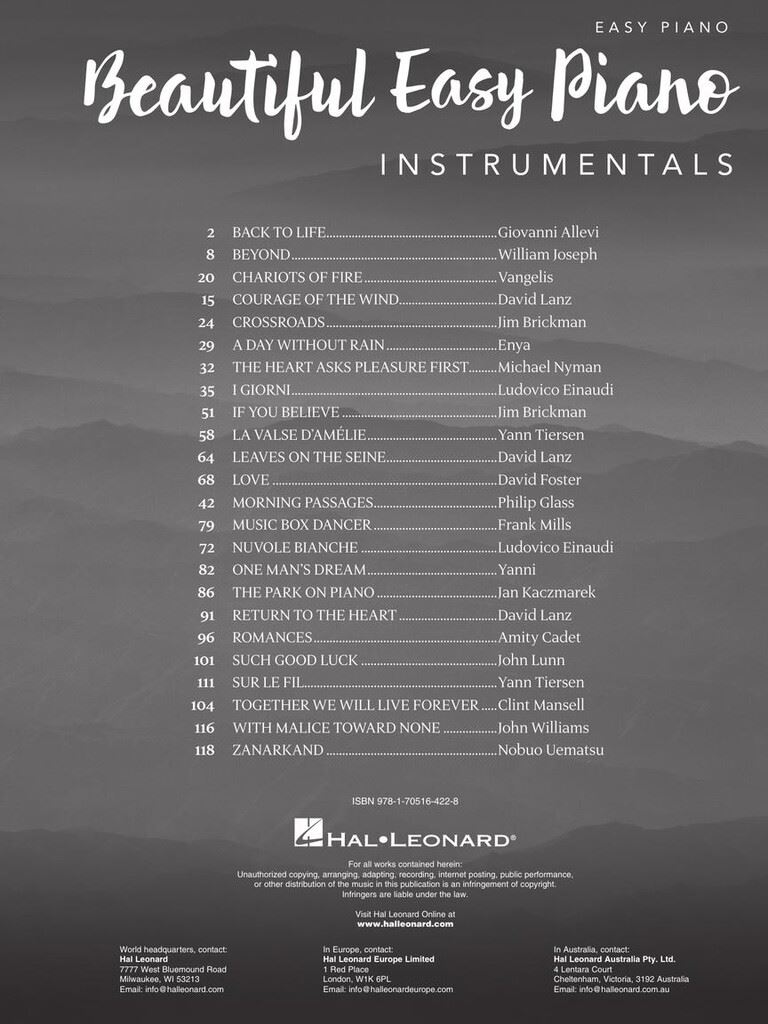 BEAUTIFUL EASY PIANO INSTRUMENTALS iz kategorije zabavna glasba sodi med odlične klavir.HL00455854 1. Back to Life [Giovanni Allevi] 2. Beyond [William Joseph] 3. Chariots of Fire ...