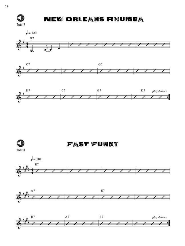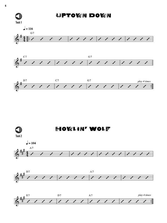 Prinesite svoj lokalni blues jam session domov! Ti bistveni utripi za blues ritem imajo profesionalno ritmično sekcijo in so kot nalašč za igranje kitare, harmonike, klaviature, saksofona in trobente, da izpopolnijo svoje solistične sposobnosti. Občutki, tempo in tipke so bili različni, da bi razširili vašo blues izkušnjo. Slogi vključujejo: naključno, funky, počasno blues, skok blues, rhumba, swing in še več. Knjiga vključuje kodo, ki omogoča dostop do zvočnih posnetkov v spletu.