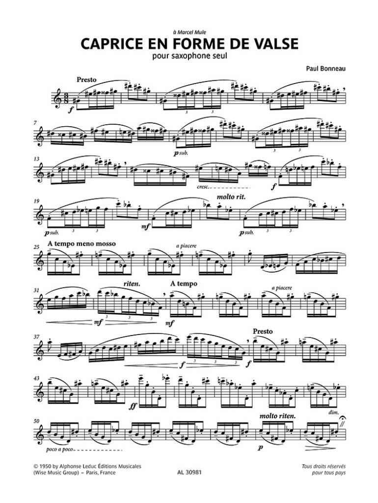 BONNEAU P:CAPRICE EN FORME DE VALSE SAXOPHONE SOLO iz kategorije skladbe sodi med odlične saksofon.Ker je saksofon pogosto povezan z džezovskim slogom, je klasični glasbi za inštru ...