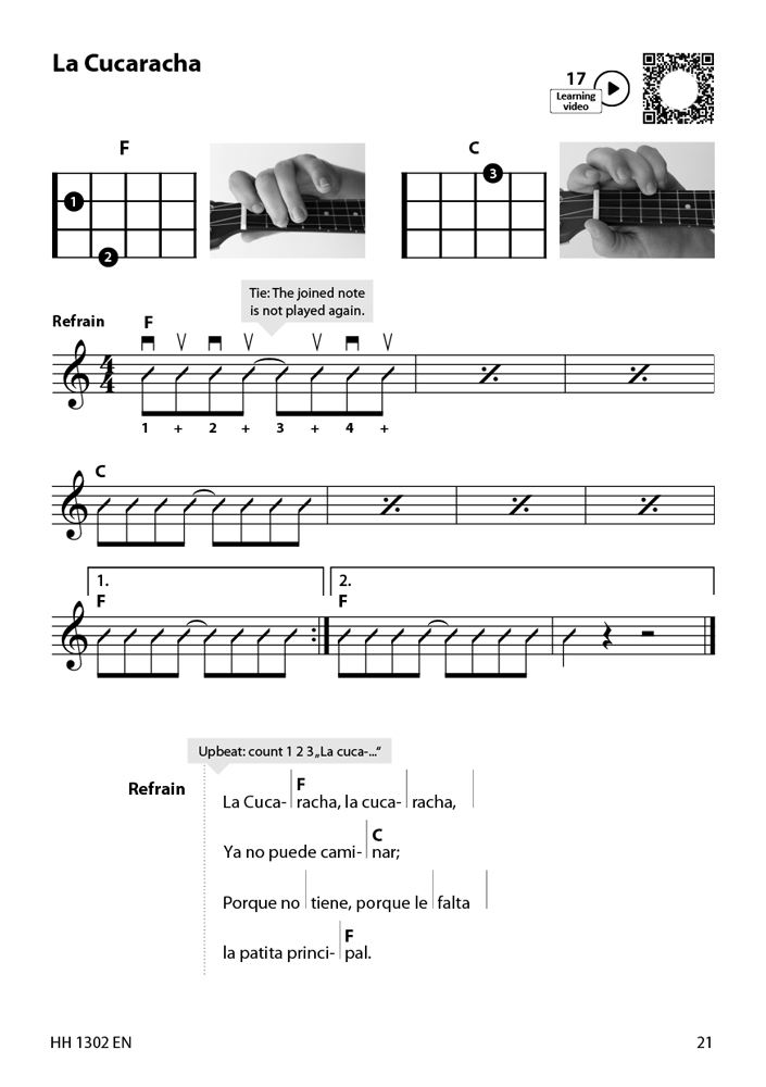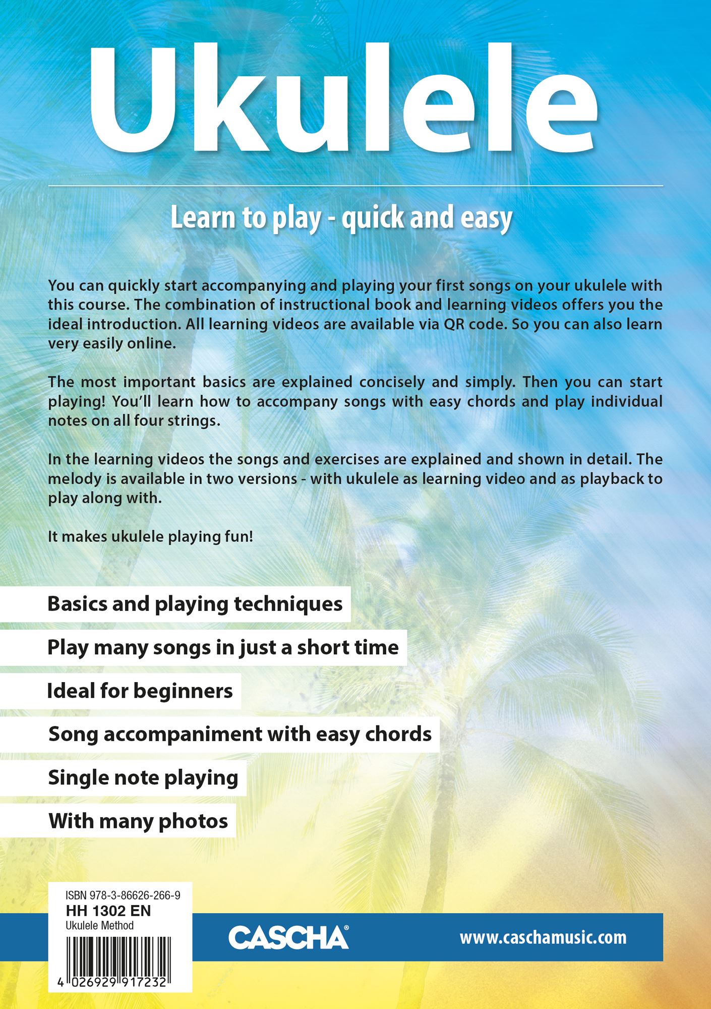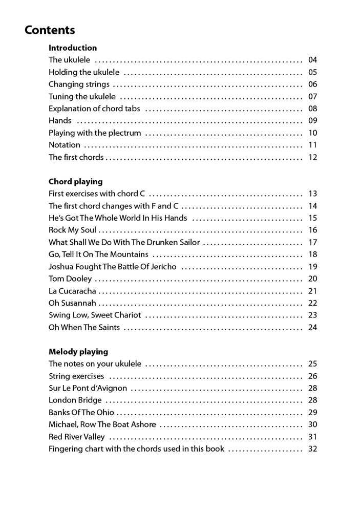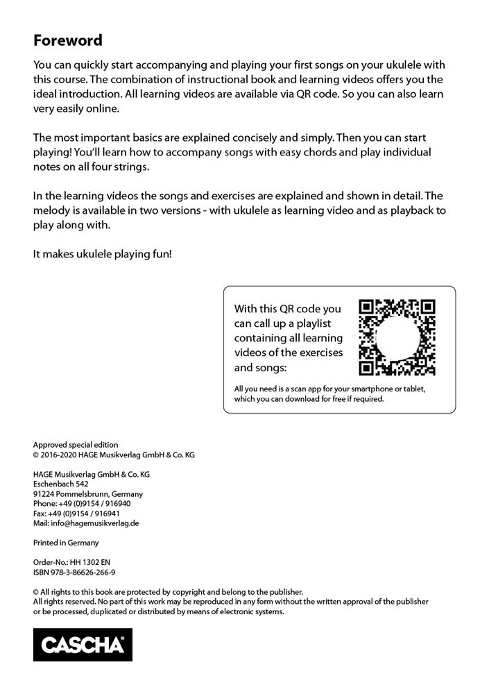 S tem tečajem lahko hitro začnete spremljati in igrati svoje prve pesmi na ukulele. Kombinacija knjige z navodili in učnih videoposnetkov vam ponuja idealen uvod. Vsi učni videoposnetki so na voljo prek QR kode. Tako se lahko zelo enostavno učite tudi prek spleta. Najpomembnejše osnove so razložene jedrnato in preprosto. Potem lahko začnete igrati! Naučili se boste spremljati pesmi z enostavnimi akordi in igrati posamezne note na vse štiri strune.