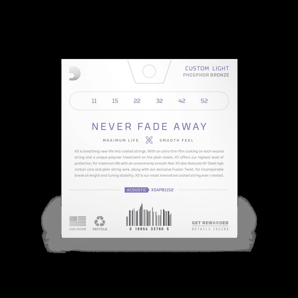 Strune XS Phosphor Bronze, ki so nastale z našim največjim prebojem na področju inovacij strun, imajo najdaljšo življenjsko dobo med vsemi strunami za akustično kitaro D'Addario. Prevleka XS daje našim toplim, uravnoteženim strunam iz fosfornega brona maksimalno življenjsko dobo z neobičajno gladkim občutkom. Strune za akustično kitaro, prevlečene s XS, so izdelane iz jedra iz NY Steel, ovitne žice iz fosfornega brona in tehnologije Fusion Twist, poleg dramatično podaljšane življenjske dobe pa imajo neprimerljivo moč pretrganja in stabilnost pri uglaševanju. 11-52 Custom Light strune imajo nekoliko več glasnosti in projekcije kot Extra Light, medtem ko so še vedno preproste za igranje.