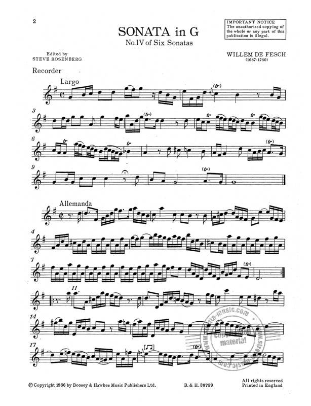 DE FESCH:SONATA IN G NO.IV OF SIX SONATAS FOR DESANT RECORDER iz kategorije skladbe sodi med odlične kljunasta flavta.
