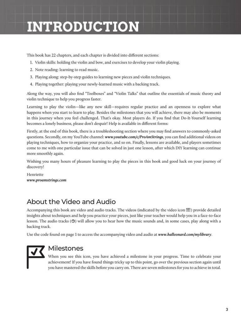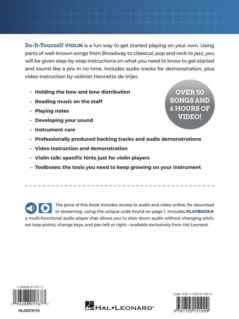 Več kot 50 pesmi in šest ur videoposnetkov! Knjiga »Naredi sam« za violino je zabaven način za začetek igranja. Z deli znanih pesmi, od Broadwaya do klasike, popa in rocka do jazza, boste prejeli podrobna navodila o tem, kaj morate vedeti, da začnete in v hipu zvenite kot profesionalec. Vključuje zvočne posnetke za demonstracijo in video navodila violinistke Henriette de Vrijer. Zajema: držanje loka in razporeditev loka; branje notnega sistema; igranje not; razvoj zvoka; nego instrumenta; profesionalno izdelane spremljevalne skladbe in zvočne demonstracije; video navodila in demonstracije; pogovor o violini: posebni namigi samo za violiniste; orodjarna: orodja, ki jih potrebujete za nenehno napredovanje pri igranju instrumenta. Cena te knjige vključuje dostop do zvoka in videoposnetkov na spletu za prenos ali pretakanje z uporabo edinstvene kode na 1. strani. Vključuje PLAYBACK+, večnamenski predvajalnik zvoka, ki vam omogoča upočasnitev zvoka brez spreminjanja višine tona, nastavitev točk zanke, spreminjanje tonalitete in panoramsko premikanje levo ali desno – na voljo izključno pri Hal Leonardu.