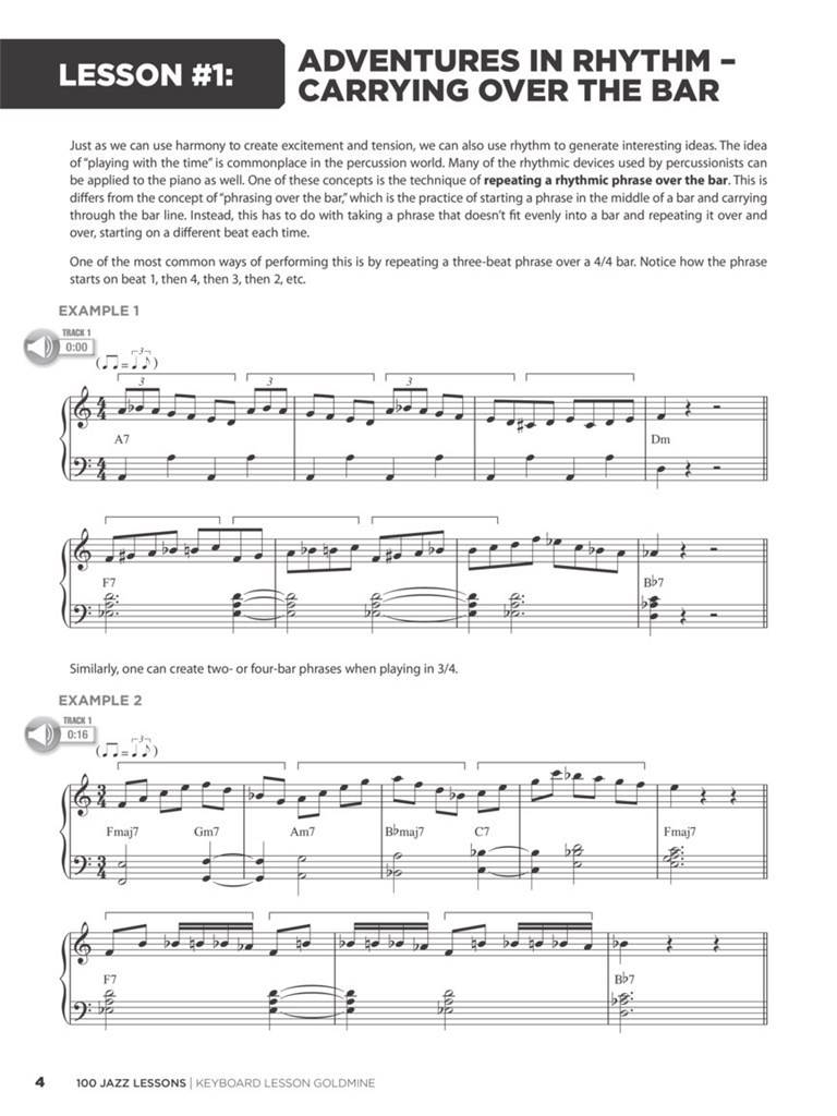 Razširite znanje o tipkovnici s serijo Goldmine Keyboard Lesson! Serija vsebuje štiri knjige: Blues, Country, Jazz in Rock. Vsak zvezek vsebuje 100 posameznih modulov, ki pokrivajo velikansko paleto tem. Vsaka lekcija vključuje podrobna navodila s primeri igranja. Dobili boste tudi izjemno koristne nasvete in še več za krepitev vaše učne izkušnje ter dostop do spletnega zvoka, ki prikazuje predstavitve vseh primerov v knjigi! 100 Jazz Lessons vključuje lestvice, načine in napredovanje - latinsko -jazzovske sloge - ideje za improvizacijo - harmonično glasovanje - gradnjo vaših odtenkov in še veliko več! Do zvoka dostopate prek spleta z edinstveno kodo v knjigi in ga lahko najbolje prenašate ali prenesete. Zvočne datoteke vključujejo PLAYBACK+, večnamenski avdio predvajalnik, ki vam omogoča upočasnitev zvoka brez spreminjanja višine tona, nastavljanje točk zanke, spreminjanje tipk in premikanje levo ali desno.