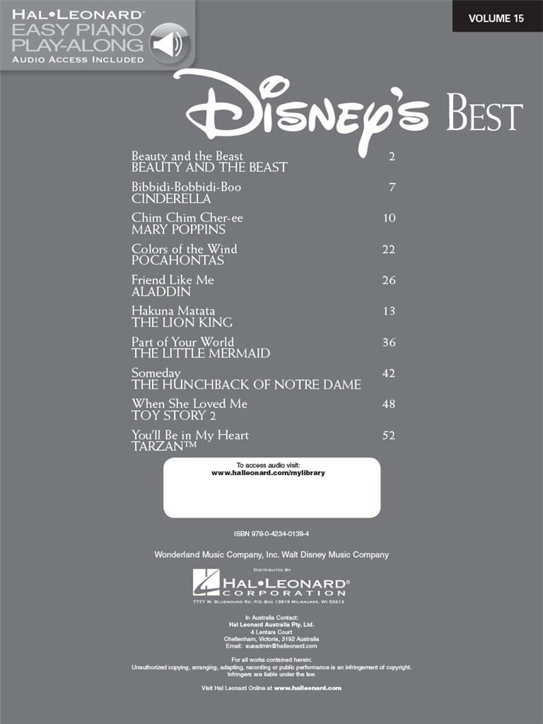 DISNEY'S BEST EASY PIANO PLAY ALONG + AUDIO ACCESS iz kategorije zabavna glasba sodi med odlične klavir.HL00311260 1. Hakuna matata 2. Beauty and the beast 3. Colors of the Wind 4 ...