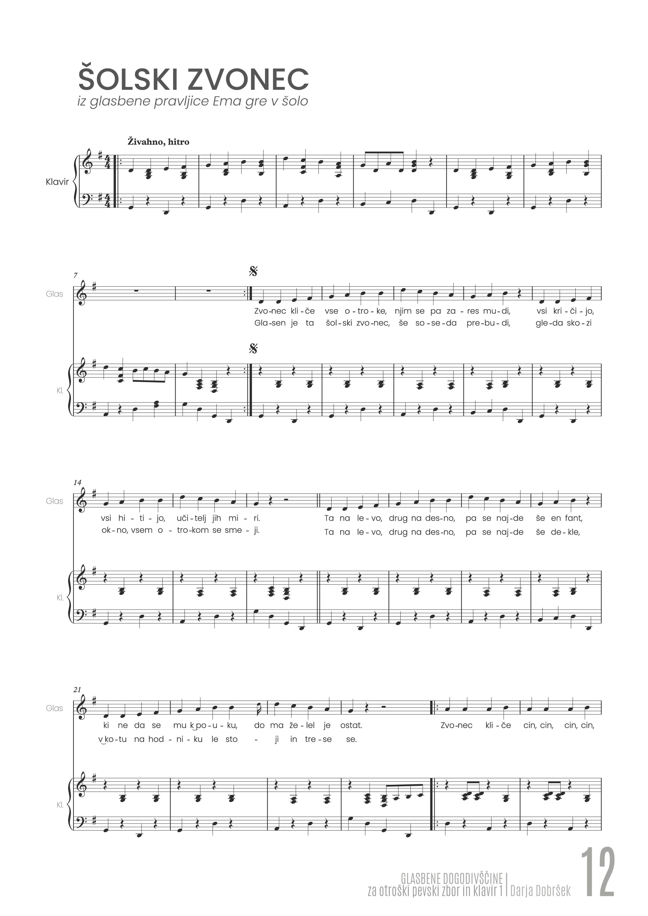 Avtorske skladbe za otroški pevski zbor in klavir. V zbirki je dvanajst pesmi, ki so bile napisane za pravljice iz Eminih dogodivščin (Ema gre v gozd, Ema in Dedek Mraz, Ema gre v šolo, Ema in stara hiša ter Ema in sinička).
