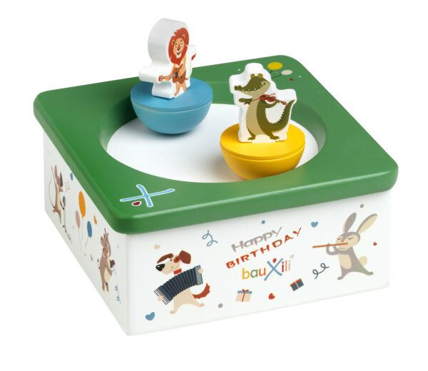 Odkrijte očarljiv svet glasbene skrinjice Bauxili in se potopite v kraljestvo, polno glasbe in čarovnije! Naša glasbena skrinjica Bauxili ni le prijeten dodatek za otroško sobo, ampak tudi zvest spremljevalec mirnih trenutkov in sladkih sanj. Glasbena skrinjica Bauxili vsebuje očarljiv prizor z živalmi iz risank, ki igrajo na različne inštrumente in nežno melodijo. Naša glasbena skrinjica Bauxili je čvrsta in trpežna, saj bo vaše najmlajše spremljala z melodijo »Happy Birthday« že vrsto let in jih vedno znova razveseljevala. Vnesite glasbo in čarobnost v življenje vašega otroka z glasbeno skrinjico Bauxili – brezčasen opomnik na majhne življenjske radosti in dragoceno darilo za vsako priložnost!