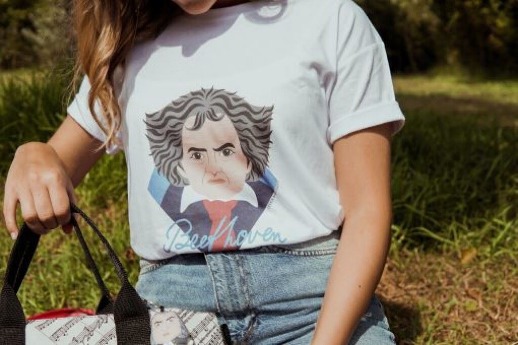 Beethoven, Ludwig van (1770-1827) Ilustrirana majica s kratkimi rokavi, potiskana na bombaž s črnili na vodni osnovi. To kolekcijo majic so navdihnili trije skladatelji, Bach, Beethoven in Mozart. Izdelano na Portugalskem pri Music Gift. 100% bombaž | Barva: bela, pralna v pralnem stroju 30 stopinj