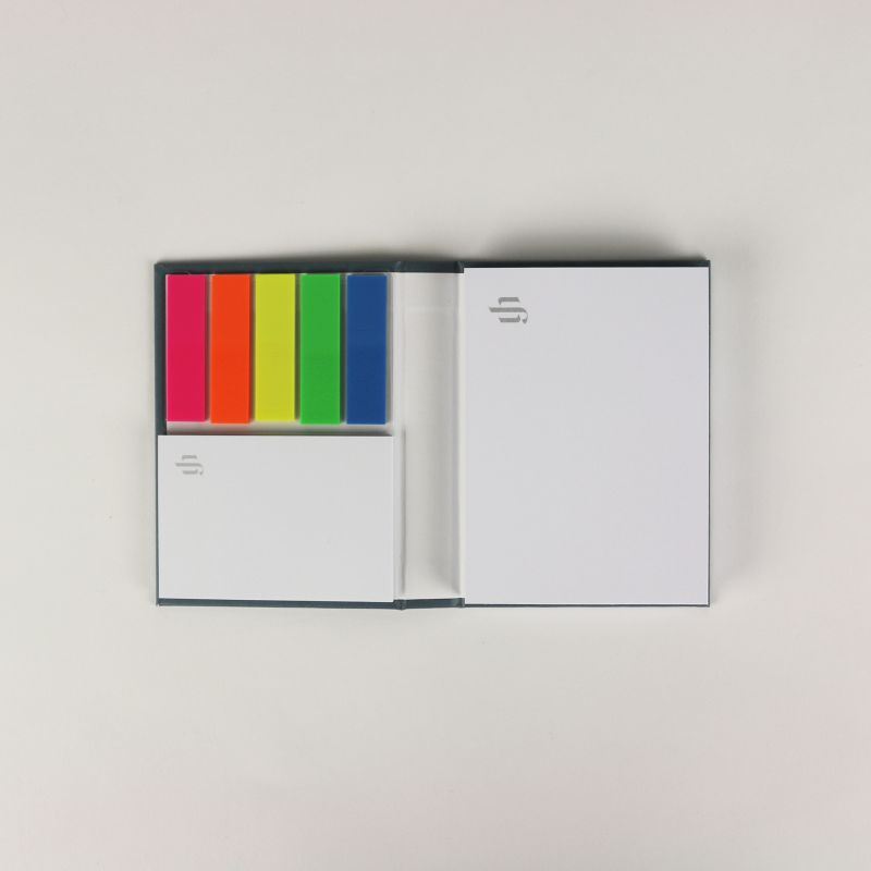 Zaprt format 77 × 106 × 18 mm, samolepilni bloki 100 × 72 mm in 50 × 72 mm, folijski flomastri 12 × 45 mm. Izdelano v Evropi.
