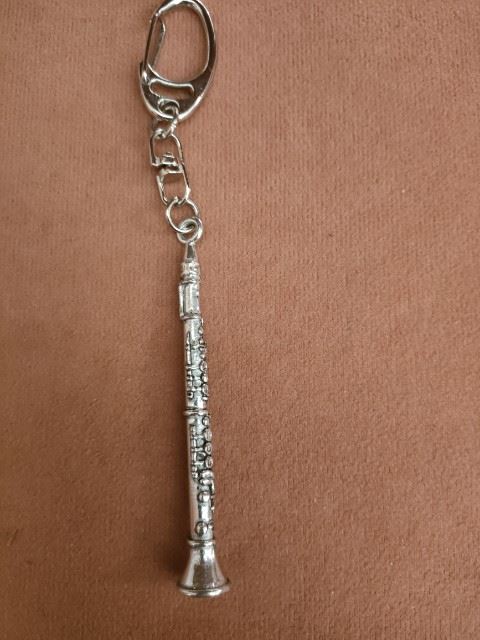 Ročno izdelan obesek za ključe iz kositra v obliki klarineta.