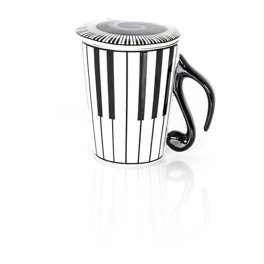 Ta eleganten komplet skodelica in pokrovov iz porcelana je okrašen z navpičnimi tipkami za klavir na vrčku in spiralno tipkovnico na pokrovu. Ta vrč je primeren za mikrovalovno pečico.