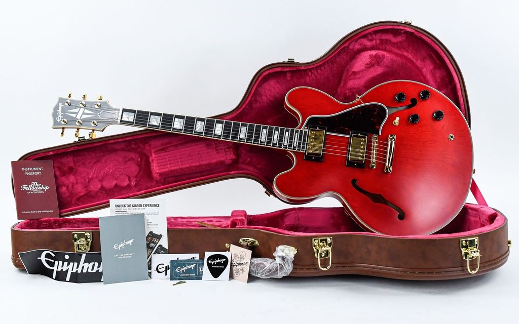 V partnerstvu z Gibson™ Custom je Epiphone s ponosom izdal ES-355 iz leta 1959, osupljivo poustvaritev vrhunskega modela ES™ iz legendarnega razreda iz leta 1959. To je vrhunski model ES v vsem svojem sijaju, od dimenzij do kontur do natančnih vzorcev vložkov in zvočne izkušnje. ES-355 iz leta 1959 ima 5-plastno ohišje iz javorja/topola s središčnim blokom iz trdnega javorja za vzdržljivost in povratno odpornost, enodelni vrat iz mahagonija z zaobljenim srednjim C profilom iz 50-ih let in frajtonarico iz ebenovine, ki jo krasi matični blok. bisernih vložkov. Glava z odprto knjigo v slogu Gibson ima vstavke z logotipom Split Diamond in Epiphone v biserni barvi, skupaj z zlatimi uglaševalci Grover® Rotomatic® in logotipom Inspired by Gibson z dvojnim diamantom, vgraviranim na zadnji strani. ES-355 iz leta 1959 poganja par Gibson Custombuckerjev, ki so ročno povezani s potenciometri CTS®, kondenzatorji Mallory™ ter izbirnim stikalom in izhodnim priključkom Switchcraft®. Priložena je tudi rjava in roza torbica iz trdega ohišja z logotipom Inspired by Gibson Custom.