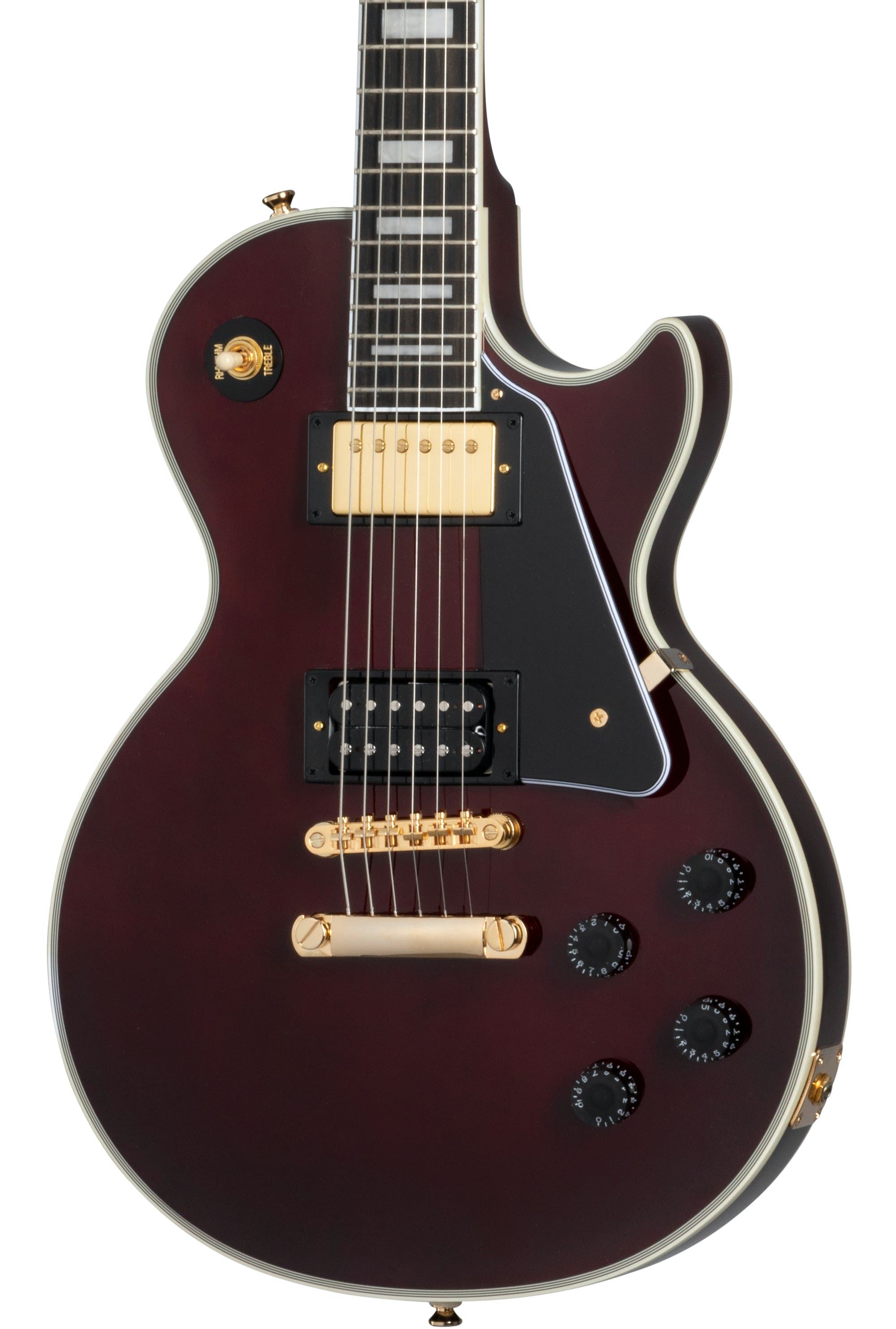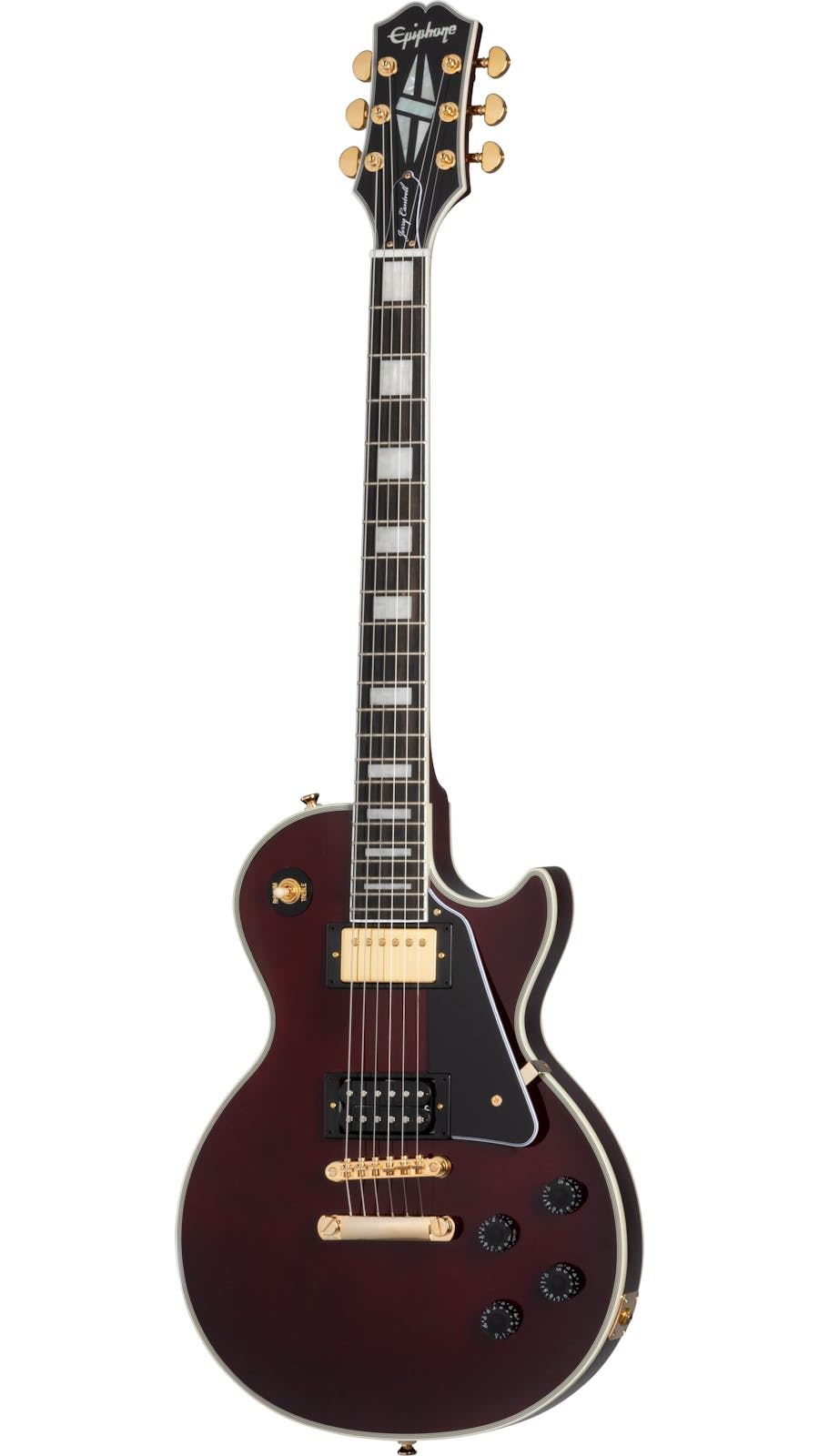 EPIPHONE Jerry Cantrell Wino Les Paul Custom (EILCJCWRGH3) električna kitara s masivnim trupom, ki jo je navdihnila ikonična Les Paul™ Custom Jerryja Cantrella, ima številne osebne dodatke, vključno s temno vinsko rdečim zaključkom na navadnem javorjevem topu in trupom iz mahagonija z 9 luknjami, zlate napenjalce, Grover® Rotomatic® Kidney tunerji, Alnico Classic PRO™ humbucker™ z zlatim pokrovom v položaju vratu in humbucker 98T PRO z izpostavljeno tuljavo v položaju mostu. Vrat iz mahagonija ima Cantrellovo zožitev po meri in ime Jerryja Cantrella je prikazano na pokrovu nosilne palice v beli pisavi, medtem ko je logotip JJ prikazan na hrbtni strani vzglavja. Priložen je kovček.