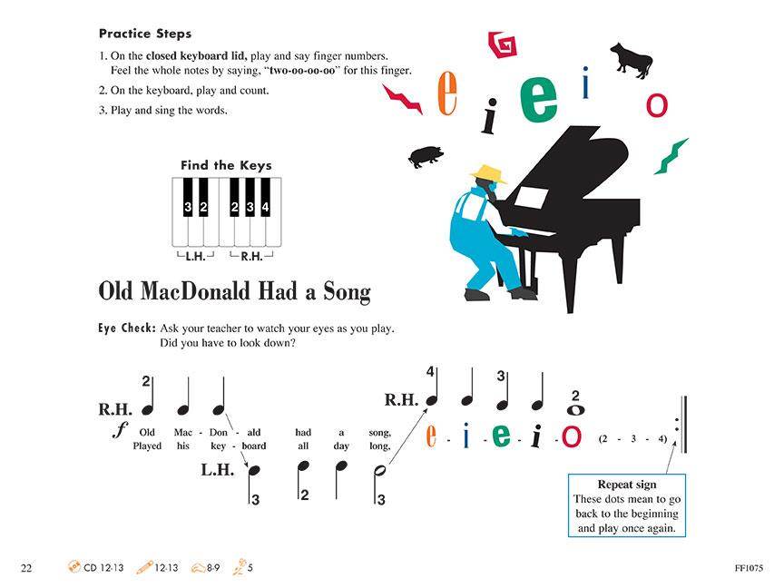 Učenci igrajo v vzorcih 5-prstnih lestvic, razvijejo prepoznavanje korakov in preskokov ter se naučijo imen črk neodvisno od številke prsta. Glasbenost se gradi z uporabo dinamike in kolorističnega eksperimentiranja s pedalom. Knjiga je organizirana v enote, ki predstavljajo glavne koncepte in spretnosti. Ob uvajanju novih enot se prejšnji koncepti in spretnosti nenehno pregledujejo.