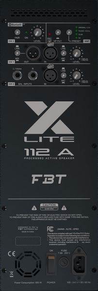 FBT X-Lite 112A - aktivni dvosistemski zvočnik polnega razpona, 12" LF zvočnik, 1" HF zvočnik, moč: 1200 W razreda D (LF) in 300 W razreda D (HF), signalni procesor DSP s 4 prednastavitvami, Bluetooth 5.0 za seznanjanje dveh zvočnikov za hkratno predvajanje glasbe in nadzor glasnosti na dveh zvočnikih, 3-kanalni mešalnik, kanal 1 in 2: 2x XLR Mic/Line vhodi, 2x 6,3 mm vhodi Mic/Line (uravnoteženi), 1x XLR Mic/Line Link out moški, kanal 3: Bluetooth 5.0, material ohišja: polipropilenska omarica z brizganjem plina, zasnovana za odpravo neželene resonance, M10 sidrne točke, 35 mm vtičnica za stojalo, 30° in 45° profil monitorja, disperzija (nominalna): 90 ° x 60° (V x V), frekvenčno območje: 50 Hz - 20 kHz (-6 dB), maks. SPL: 129 dB, mere (Š x V x G): 356 x 619 x 357 mm, teža: 16,3 kg, barva: črna