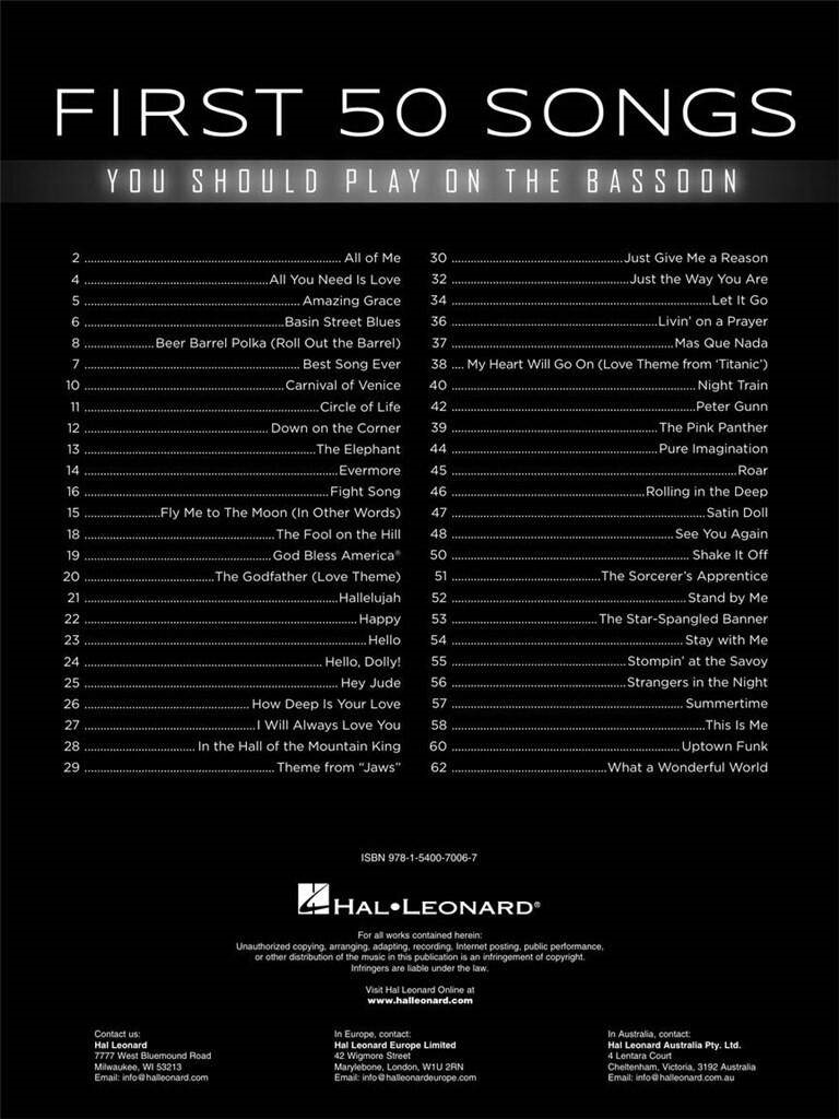 FIRST 50 SONGS YOU SHOULD PLAY ON THE BASSOON iz kategorije zabavna glasba sodi med odlične fagot.HL00322934 1. Circle of Life 2. Stay With Me 3. Happy 4. Hello 5. All of Me 6. Al ...