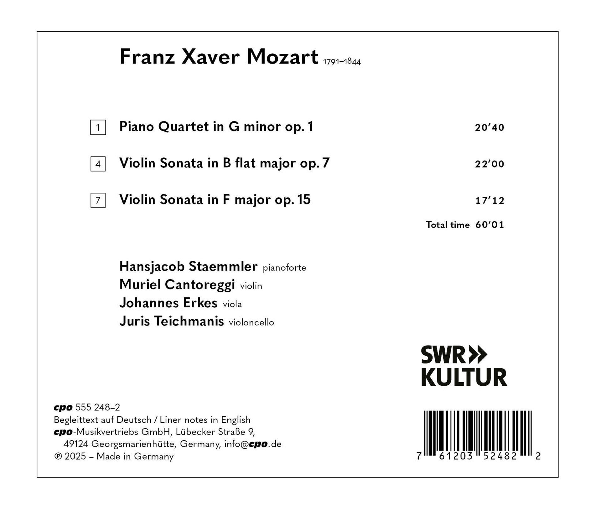 FRANZ XAVER MOZART:PIANO QUARTET OP.1/VIOLIN SONATAS OPP.7 & 15