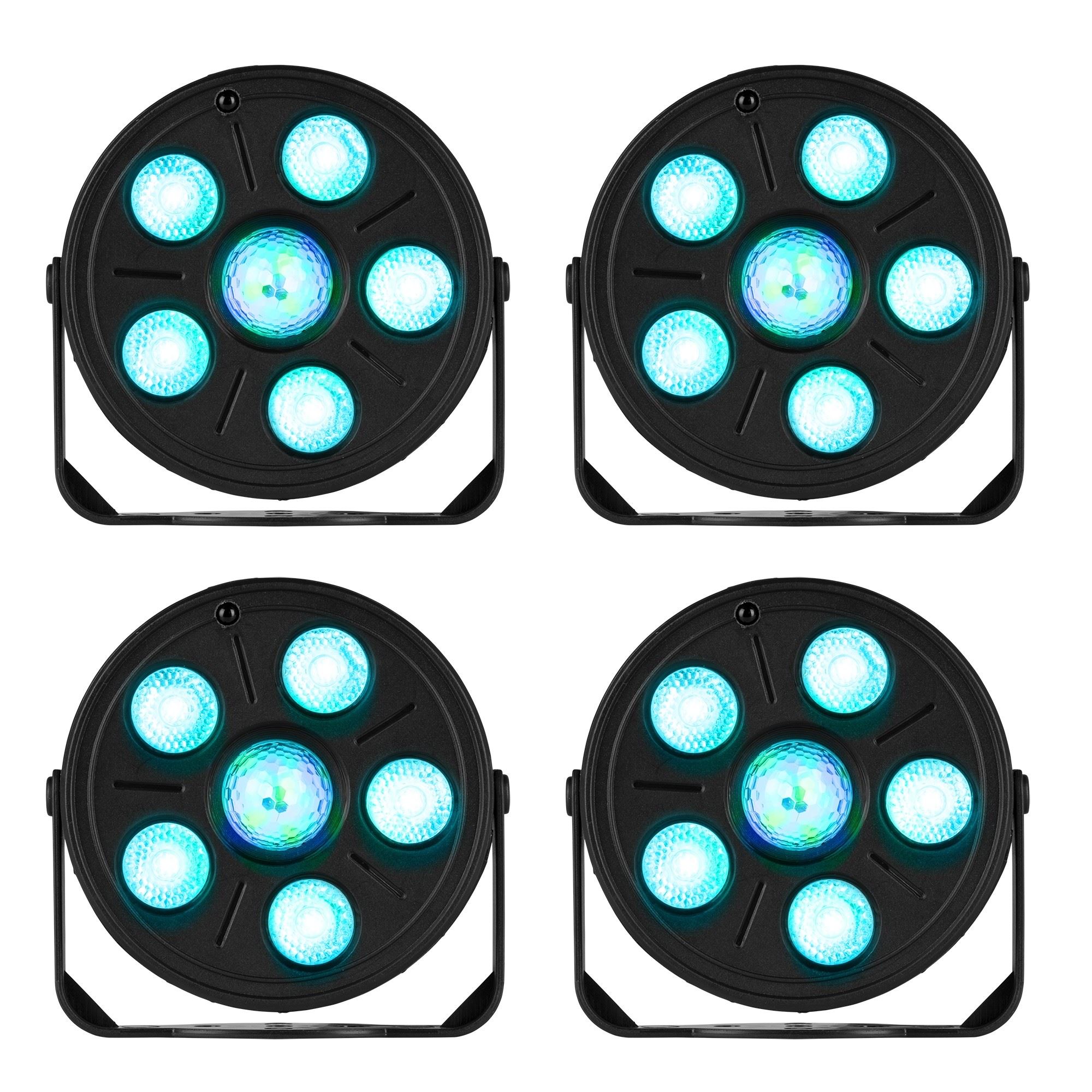 Komplet 4 svetlobnih efektov Party Par 5x visokozmogljivih RGB LED diod 1x RGB učinek žele kroglice v sredini Mešanje barv rdeče/zelene/modre barve Samodejni programi svetlobne predstave Močno ABS ohišje in nosilec Vključno z daljinskim upravljalnikom Barva: črna