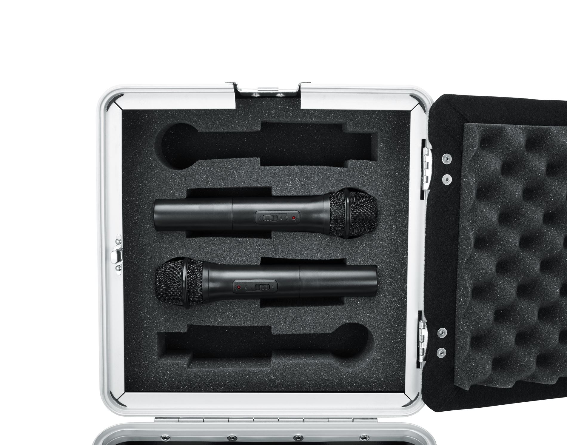 Za 4 brezžične sisteme Robustna polietilenska konstrukcija 4 police za pol stojala z dvostranskim lepilnim trakom 4 držala za mikrofon/telesni paket pod pokrovom Žep za dodatno opremo Zavit pokrov iz pene Ojačani kromirani vogali Vdolbene kromirane zapahe Notranjost, obložena s preprogo Zgornji ročaj za nošenje Gumijaste nogice