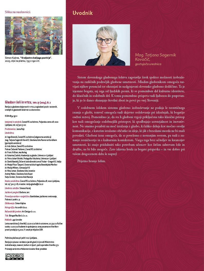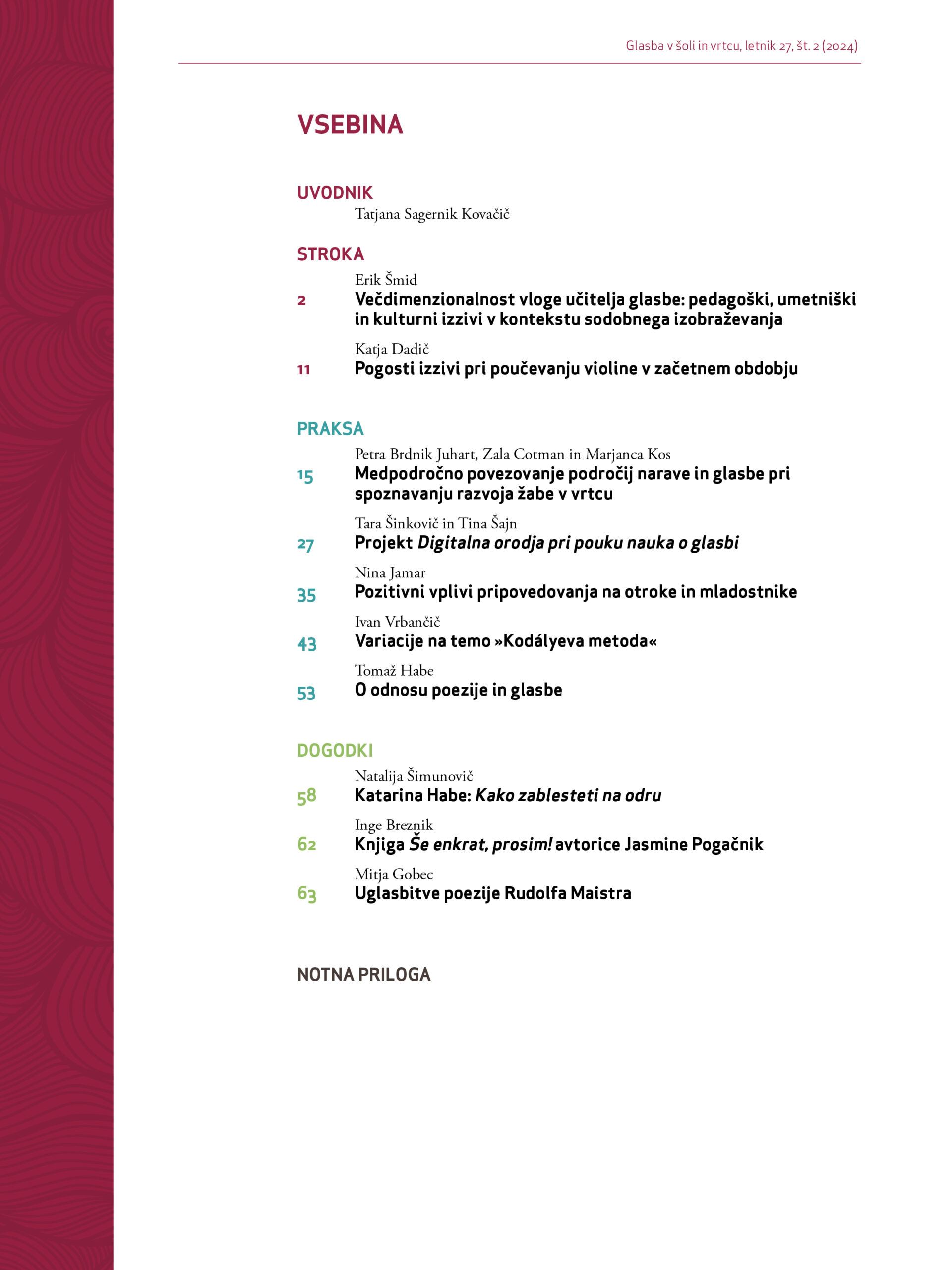 Izzivi pouka glasbe v današnji šoli smo naslovili aktualno številko revije Glasba v šoli in vrtcu; v rubriki Stroka pišemo o večdimenzionalnosti vloge učitelja glasbe in pogostih izzivih pri poučevanju violine v začetnem obdobju. Rubrika Praksa posega po različnih področjih, od povezovanja področij narave in glasbe pri spoznavanju razvoja žabe v vrtcu, kjer z uporabo pesmi o razvoju žabe izhajamo iz iniciative otrok, do uporabe digitalnih orodij pri pouku nauka o glasbi ter pozitivnih vplivov pripovedovanja, tematsko povezanega z glasbo, na otroke in mladostnike; objavljamo še kritično razmišljanje o Kodályevi metodi ter predstavljamo odnos med poezijo in glasbo skozi bogat slovenski opus besedne in glasbene umetnosti. Predstavljamo znanstveno monografijo Kako zablesteti na odru in didaktični priročnik za učitelje Še enkrat, prosim!; številko sklenemo s popisom uglasbitev del Rudolfa Maistra. Notna priloga vsebuje tri skladbe Toneta Žuraja za srednješolske zbore, ki so izvajalsko zahtevnejše, ter enoglasno pesem Vanje Lampič s klavirsko spremljavo za otroške pevske zbore.