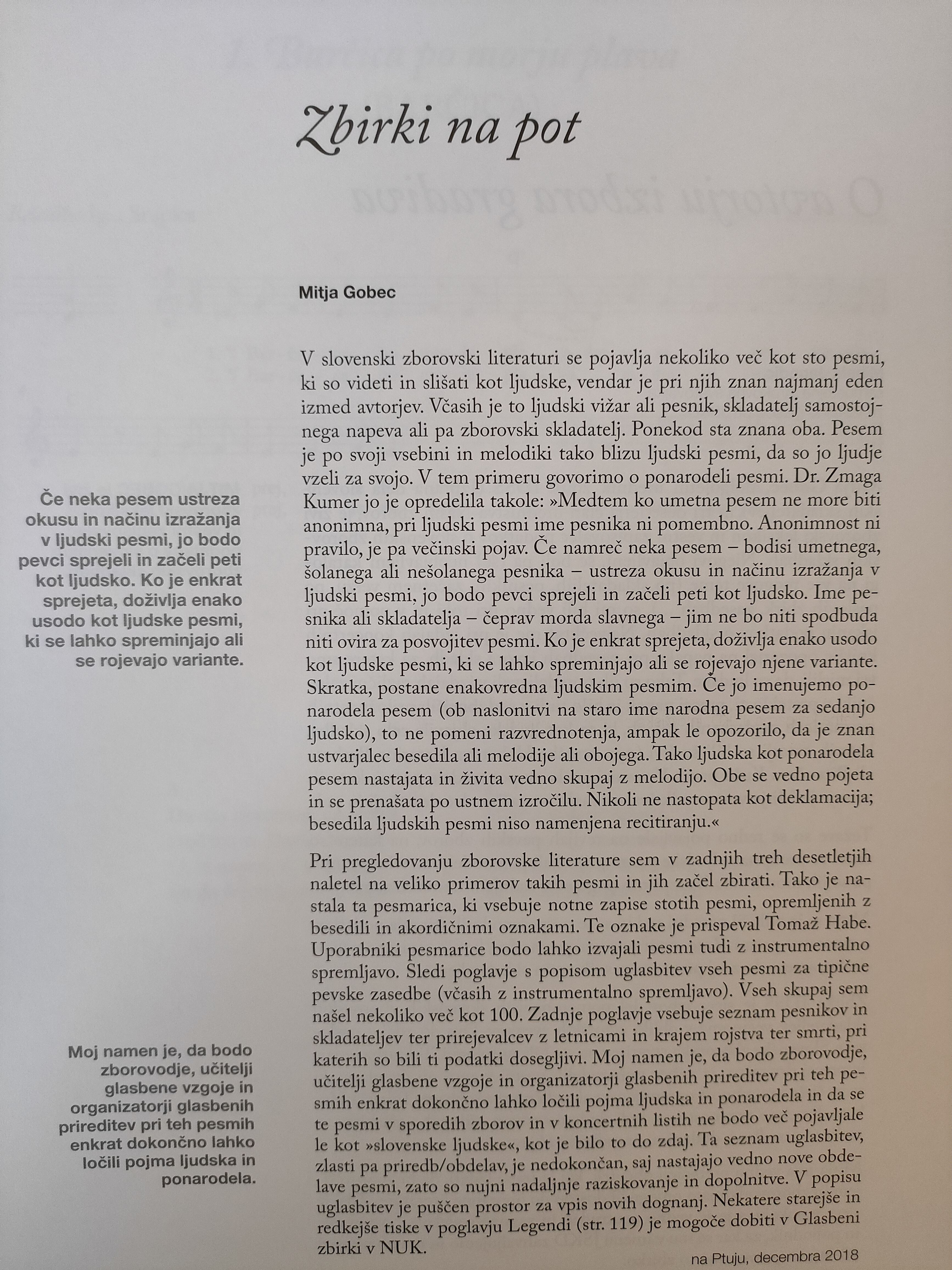 Tokratni 47. zvezek Izbranih del slovenskih skladateljev (IDSS) je precej drugačen od dosedanjih. Ne prinaša opusa posameznih slovenskih zborovskih skladateljev temveč zapise stotih slovenskih ponarodelih pesmi, ki jih je v treh desetletjih zbral Mitja Gobec. Zbrane pesmi, so po svoji melodiki in vsebini videti in slišati ljudske, a so jih ljudje vzeli za svoje. Pri teh skladbah je znan najmanj eden od avtorjev, zato so opredeljene kot ponarodele pesmi. Zapisane so v eno- ali dvoglasju, za izvajanje z inštrumentalno spremljavo in opremljene z akordičnimi oznakami, ki jih je prispeval Tomaž Habe.