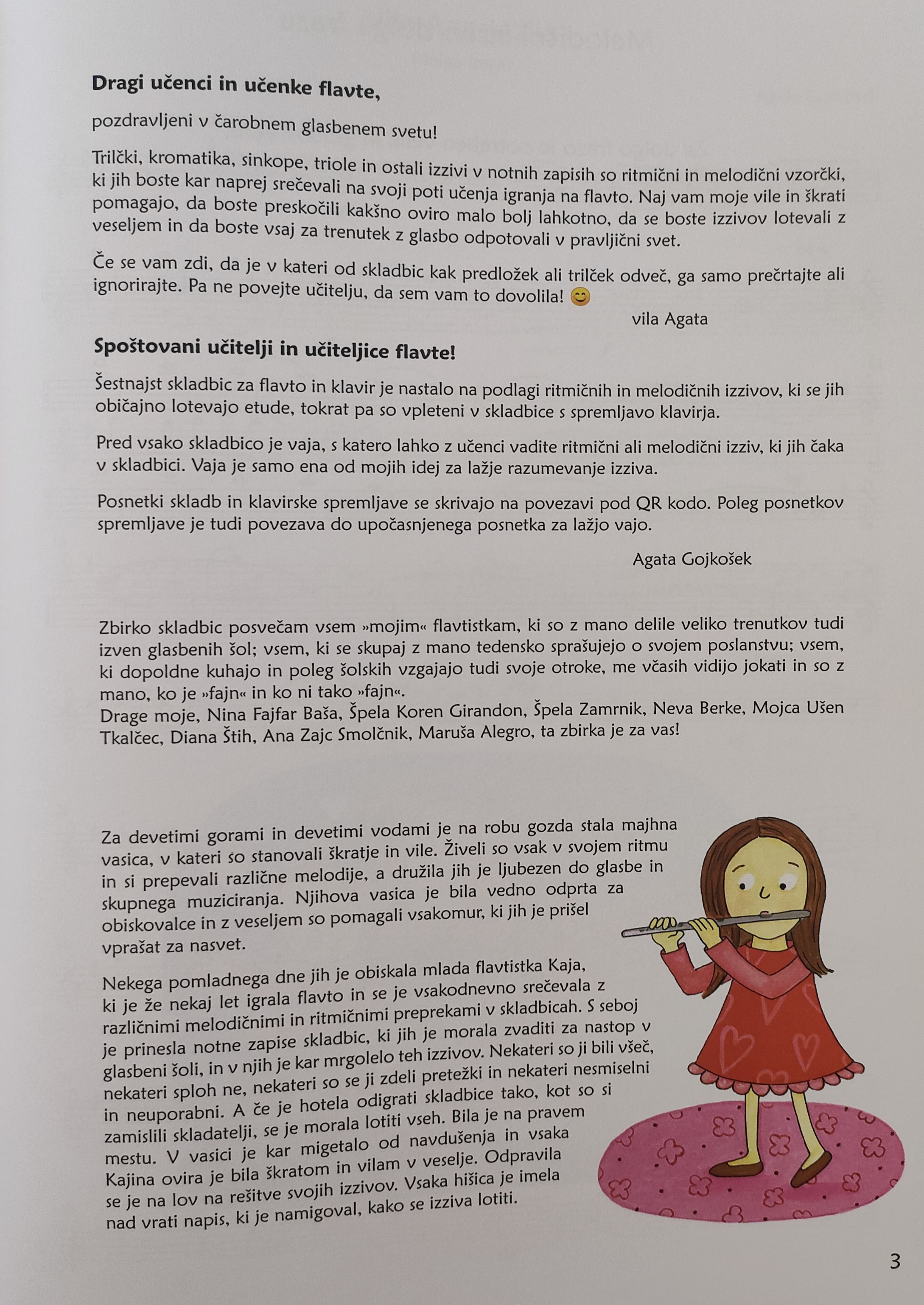 Skladbe so po zahtevnosti flavtne partiture primerne za izvajanje v različnih razredih nižje glasbene šole. Glavna knjižica vsebuje vaje in skladbice za flavto, ki jih spremljata napovedni verz in čudovite ilustracije Urške Stropnik Šonc. Knjižica vsebuje povezavo do spletne strani s posnetki skladb in klavirske spremljave. Priloženi so tudi upočasnjeni posnetki klavirske spremljave za lažjo vajo. V ločeni knjižici je zbrana celotna partitura s klavirsko spremljavo.