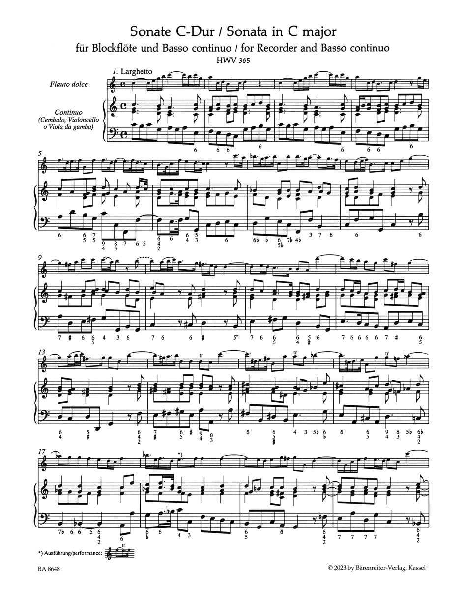 Ta enotna izdaja je del serije priljubljenih del iz kataloga Bärenreiter ob praznovanju 100. obletnice založbe. Predstavlja odlomek iz antologije Enajst sonat za flavto in basso continuo (BA04225). To reproducira Urtext "Halle Handel Edition". Sonata v C-duru HWV 365 obsega pet stavkov (1. Larghetto, 2. Allegro, 3. Larghetto, 4. A tempo di Gavotta, 5. Allegro). Uživa veliko priljubljenost in čeprav je v virih označena kot sonata za flavto, se prav tako pogosto igra na flavto.
