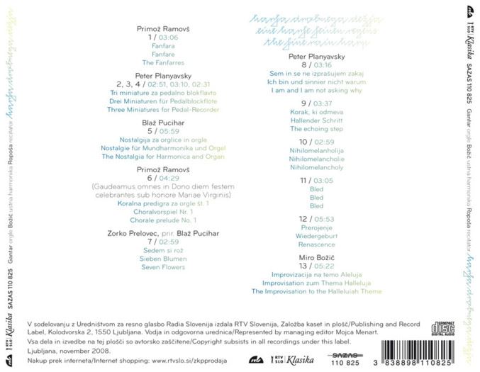 Polona Gantar na orglah, Miro Božič na ustni harmoniki in Jožef Ropoša kot recitator v skladbah Petra Planyavskyega, Primoža Ramovša, Blaža Puciharja, Zorka Prelovca in Mira Božiča; le-te so izvirna glasbena dela ali priredbe, ustvarjene posebej za glasbeni sestav orgel in ustne harmonike.