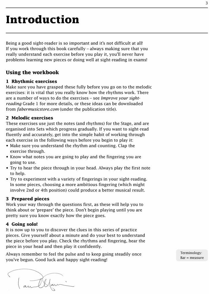 Zdaj bolj kot kdaj koli prej je sposobnost tekočega branja iz vida bistveni del usposabljanja glasbenikov na inštrumentu. Ta delovni zvezek je zasnovan tako, da pomaga premagati živce, ki lahko povzročijo težave pri branju z vida, tako da daje dobre tehnične nasvete in nasvete za krepitev samozavesti. Korak za korakom pomaga violinistu ustvariti popolno sliko vsake skladbe, najprej z ritmičnimi in melodičnimi vajami, povezanimi s specifičnimi problemi, nato s preučevanjem pripravljene skladbe s pripadajočimi vprašanji, na katera mora študent odgovoriti, in končno z resničnim , sam nepripravljen test branja iz vida. Potrditvena polja za vsako stopnjo omogočajo učitelju in učencu, da spremljata napredek.