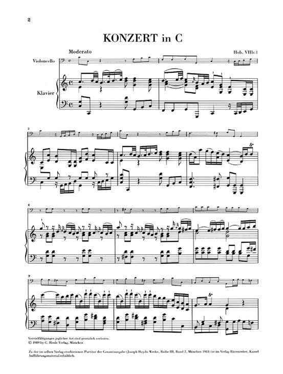 Koncerti Josepha Haydna za violončelo in orkester izstopajo s svojo lahkotnostjo in eleganco. Koncert v C-duru Hob. VIIb: 1 je bil najverjetneje napisan med letoma 1762 in 1765, ko je Haydn že služboval kot Kapellmeister ali glasbeni direktor princu Esterházyju. Koncert je bil dolgo znan le po vpisu Haydna v njegov rokopisni katalog del, sama glasba pa ni bila znana. Šele leta 1961 je bila najdena kopija dela in od takrat se uspešno drži proti Koncertu v D-duru Hob. VII: 2. Za to izdajo koncerta s klavirsko spremljavo smo pridobili storitve Haydnove strokovnjakinje Sonje Gerlach. Edicijo Urtext popestri s podrobnim predgovorom, ki se osredotoča tudi na izvedbo okraskov in kadenc.