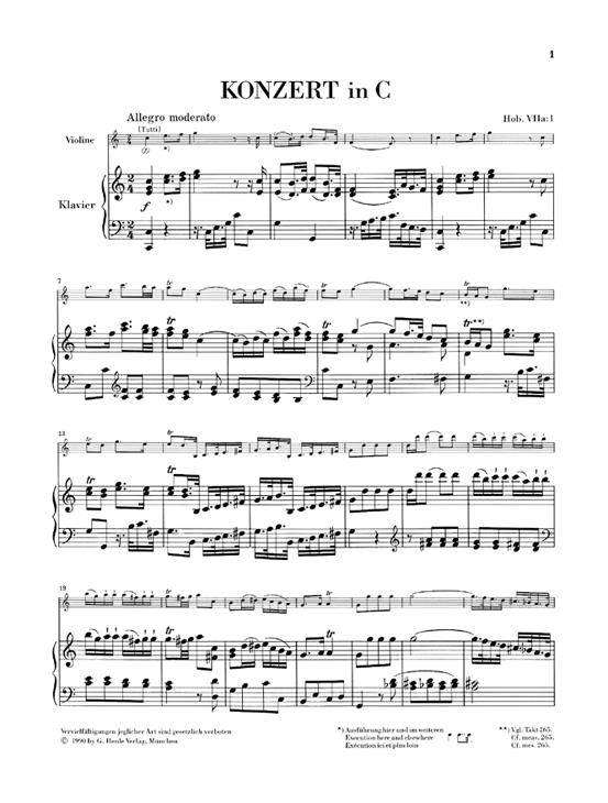 Haydnova koncertantna dela, napisana na dvoru knezov Esterházy, odražajo spretnosti posameznih članov dvornega orkestra Esterhazy. Tako je Haydn ustvaril violinski koncert v C-duru Hob. Vlla: 1 za koncertnega mojstra dvornega orkestra Luigija Tomasinija, znanega violinista tistega časa in tudi samega skladatelja. Tomasini je Haydna verjetno navdihnil za tehnično briljantnost in prijeten italijanski ton, ki odmeva skozi ta še vedno kvazi-baročni koncert. Naša izdaja Urtext temelji na celotni izdaji Haydn, ki jo je prav tako objavila G. Henle Verlag. V podrobnem predgovoru je mogoče prebrati, pri katerih virih smo se posvetovali za izdajo, ki jo zaokrožajo prefinjeni pokloni in prsti Kurta Guntnerja in kadence, ki jih je ustvaril Franz Beyer