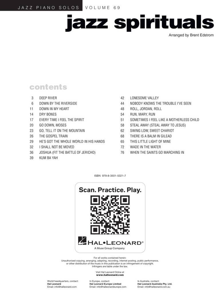 JAZZ PIANO SOLOS JAZZ SPIRITUALS VOL.69 iz kategorije zabavna glasba sodi med odlične klavir.HL01854418 1. Deep river 2. Down by the Riverside 3. Down in My Heart 4. Dry Bones 5. ...