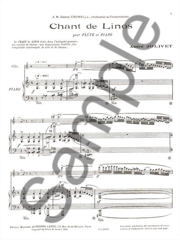 André Jolivet (1905-1974) je sestavil Chant de Linos za Solo de Concours na pariškem konservatoriju leta 1944. Ta različica je bila sprva napisana za flavto, harfo in godalni trio in vsebuje partiture za flavto in klavir. Ta komad je precej težko izvesti, vendar bo izstopal na tekmovanju ali recitalu. Ta del je navdihnjen iz tega, kar se v grški antiki imenuje Chant de Linos, trendi (ali objokovanje mrtvih), in govori tudi o Linosu, sinu Apolona. Dober glasbenik, Linos je učil Orfeja Liro in Herakle ga je ubil, ker ga je preveč kritiziral. André Jolivet je francoski skladatelj, ki ga je resnično navdihnila antika in je močno zanimal za atonalnost. Napisal je tudi veliko komornih skladb, enajst koncertov, nekaj orkestrske in nekaj vokalne glasbe.