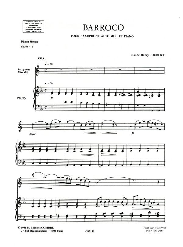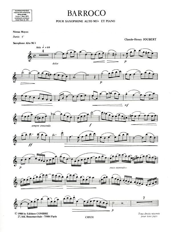 JOUBERT:BARROCO ALTO SAXOPHONE ET PIANO iz kategorije skladbe sodi med odlične saksofon.