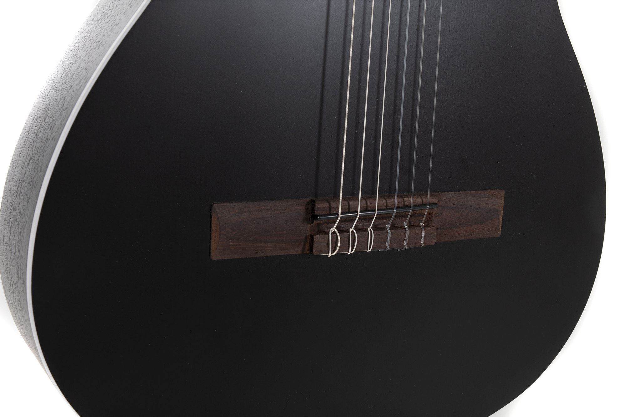 Zgornja plošča: masivna smreka Rozeta z lesenim mozaikom in zvočno odprtino Hrbtna stran in stranice: mahagoni sapelli Vrat okoume z ojačitvijo iz karbona Ubiralka in kobilica iz ovangkola Pozlačena glava stroja s črnimi gumbi in gredmi Intarzija matice in kobilice iz karbona ABS vezivo ohišja z rdečo dekorativno oblogo Okolju prijazna mat barva na vodni osnovi z odprtimi porami Originalni komplet strun Hannabach 600HTG3C s karbonom G3, izdelano v Nemčiji Telo: črno, mat E-acoustic Predojačevalnik GEWA ETC-4 s 4-pasovnim izenačevalnikom in uglaševalnikom Plosko ohišje Širina matice 48 mm