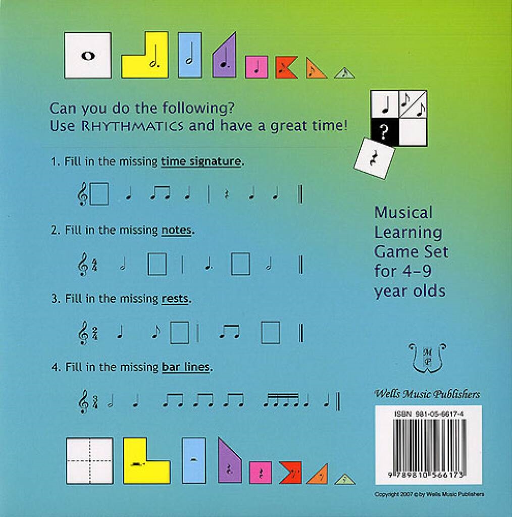 Za majhne otroke je nepogrešljiv učni pripomoček. Zaznavanje ritmov v glasbi ne bo več begajoča izkušnja. Za večino učiteljev bo poučevanje ritmov, zlasti frakcij notnih vrednosti in združevanja taktov za majhne otroke zdaj zabavno in enostavno. Primerno za otroke od štirih do devetih let.
