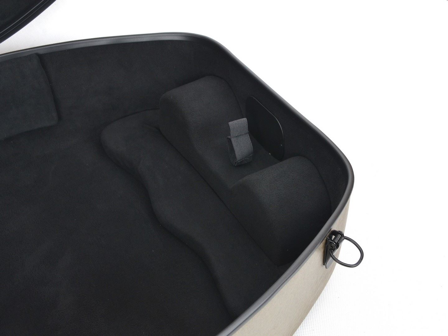 Notranjost je oblečena v mehko flanelo in je opremljena z žepom za dodatke, pasom z zaponko za vrat violončela in pritrjeno konico za violončelo z gumijastim trakom, dvema držaloma za lok.