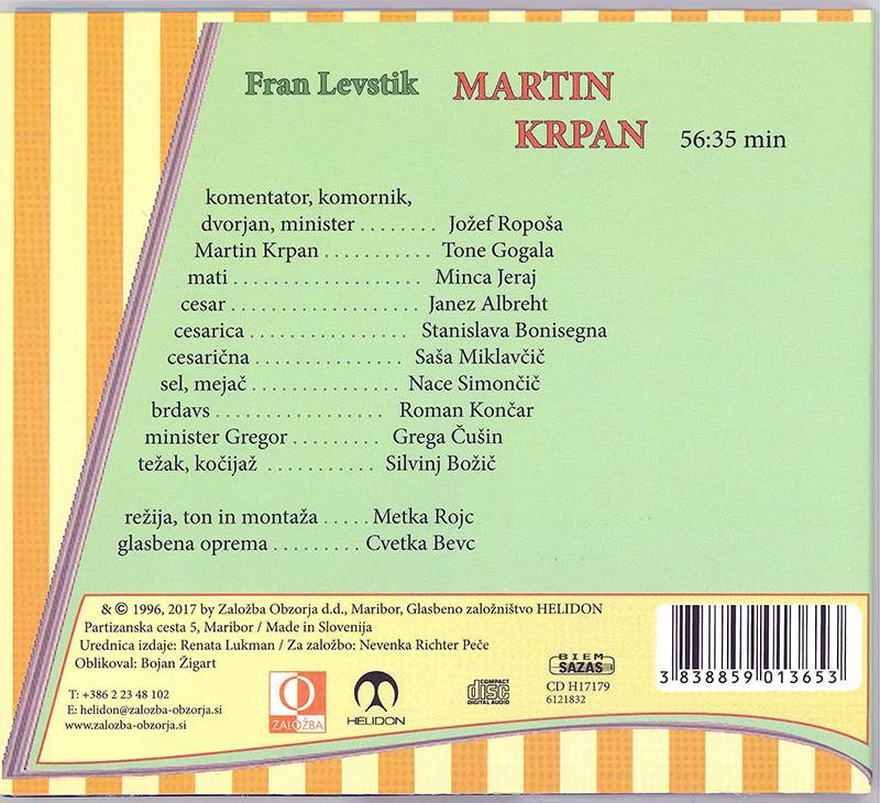 LEVSTIK:MARTIN KRPAN PRAVLJICA iz kategorije otroški sodi med odlične cd.godbo je napisal Fran Levstik 1858 leta. Glavni lik je Krpan z Vrha, močan, samosvoj človek, ki tihotapi so ...
