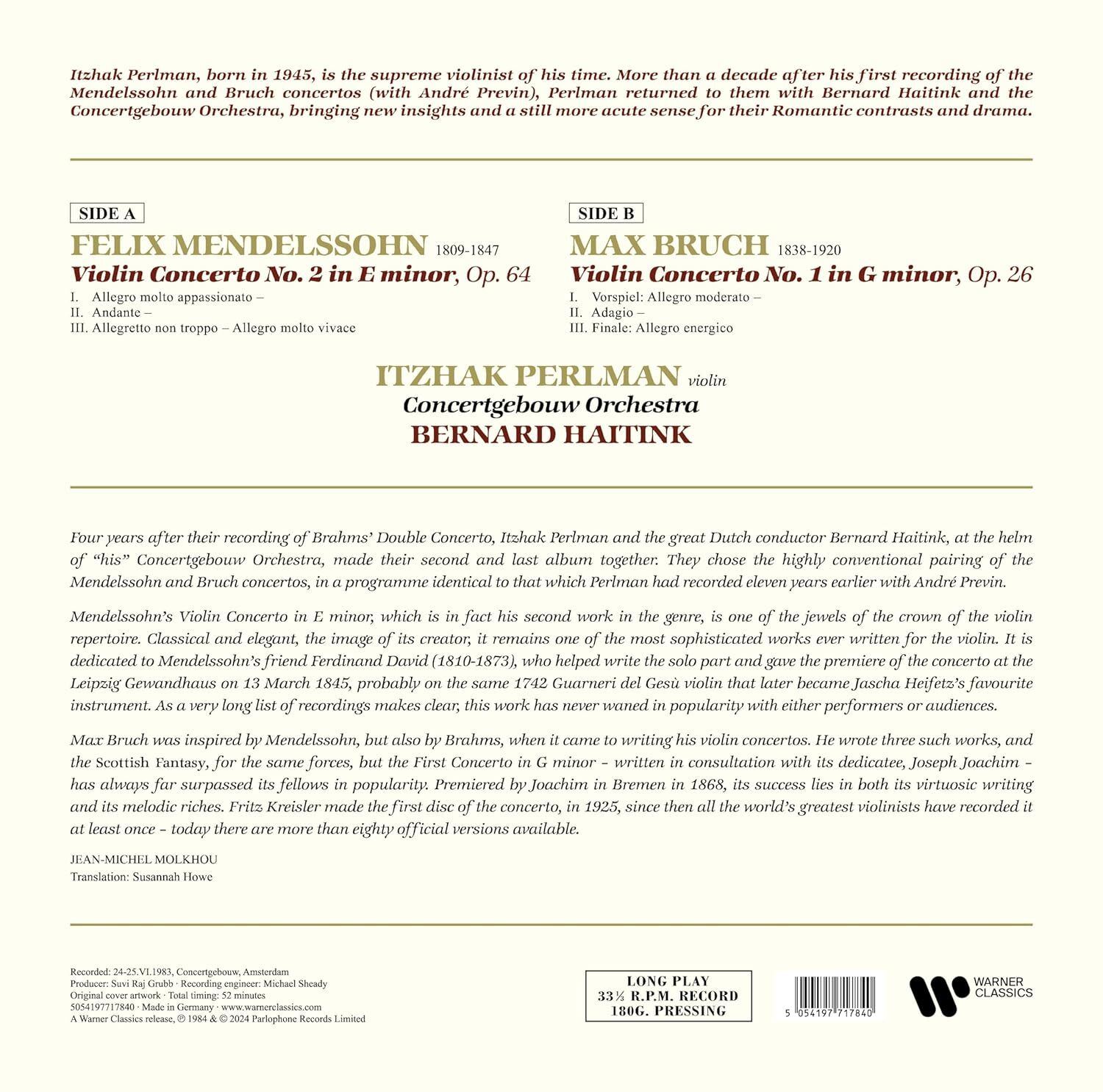 MENDELSSOHN/BRUCH:VIOLIN CONCERTOS/PERLMAN/HAITINK iz kategorije lp sodi med odlične Nosilci zvoka in slike.