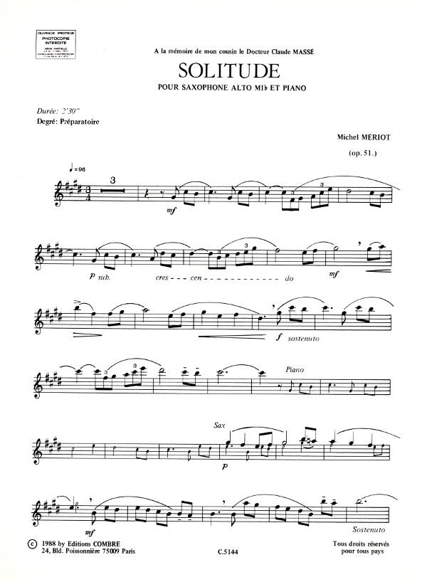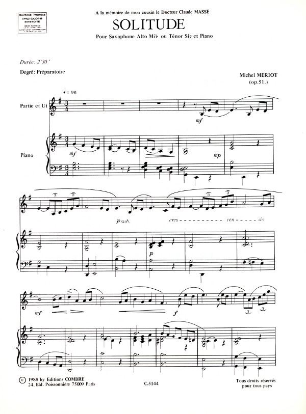 MERIOT M.:SOLITUDE,OP.51 ALTO SAXOPHONE ET PIANO iz kategorije skladbe sodi med odlične saksofon.