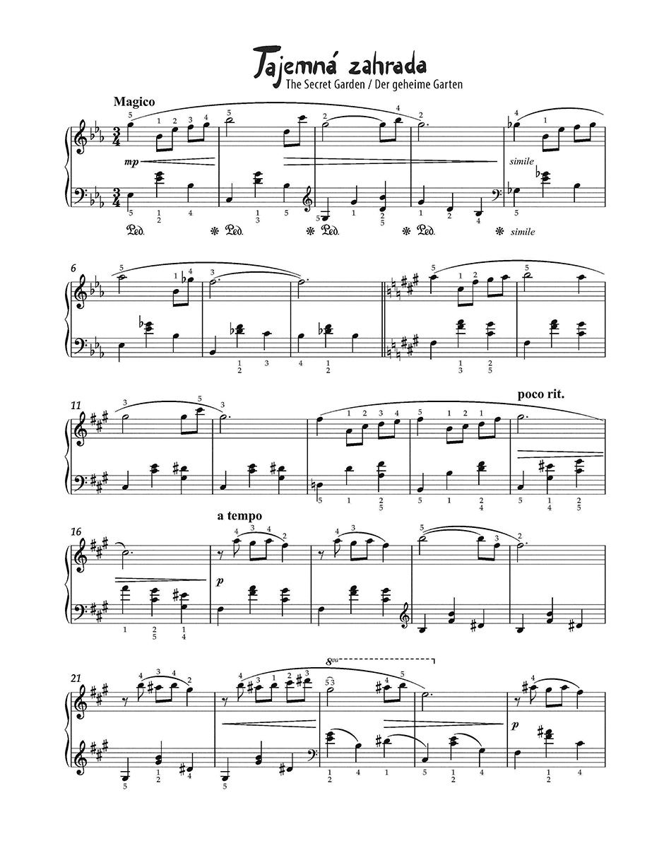 Album “The Secret Garden” Jakuba Metelke (r. 1986) vsebuje petnajst recitalnih skladb v preprosti pesmi in se tako navezuje na njegov uspešen, tehnično manj zahteven klavirski cikel “Mali virtuoz” (BA11569). Posamezne skladbe v zbirki zaznamuje Metelkov nezamenljiv, tonsko zasidran melodični slog, obogaten s številnimi nenavadnimi harmonijami in barvami, ki na tem mestu poudarja rahlo melanholičen in skrivnosten značaj teh nočnih skladb. Igrive ilustracije Andree Tachezyja odražajo ta razpoloženja na domiseln in očarljiv način.